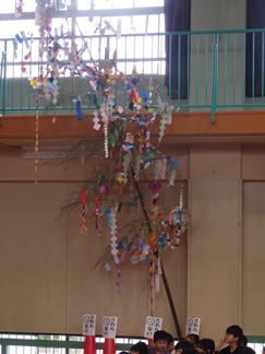 | 七夕集会では集会委員の児童が織姫と彦星の劇を行いました。衣装も工夫されていました。皆の願いを飾った笹が素敵でした。 |