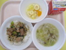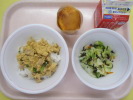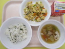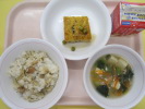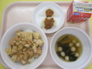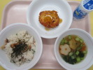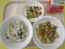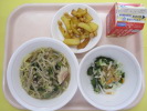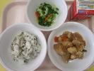 | 小松菜そぼろご飯 かえり煮干しの甘辛揚げ こんにゃく入り海藻サラダ 牛乳 |