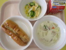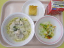 | ビーンズドッグ かぶとじゃがいものクリームスープ りんごサラダ 牛乳 |