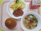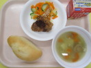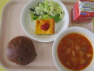 | ぶどうパン 豚肉のバーベキューソース 花野菜のミモザサラダ トマトスープ 牛乳 |
