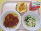 | スパゲティミートソース キャロットドレッシングサラダ こまつなケーキ 牛乳 |