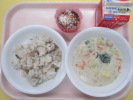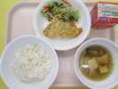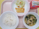 | ご飯 鶏肉のくわ焼き わかめサラダ かきたま汁 牛乳 |