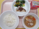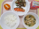 | ご飯 魚のごまだれ焼き からし和え ふるさと汁 牛乳 |