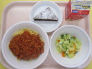 | スパゲティミートソース マセドアンサラダ ももゼリー 牛乳 |