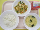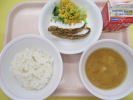 | ご飯 小魚のスパイシー揚げ 卵と野菜の和え物 豆腐とえのきのみそ汁 牛乳 |