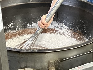 14日のバレンタインデーにちなんで、チョコレートを使ったケーキ「ガトーショコラ」を給食室で手作りしました。給食ではコーティングチョコレートという、製菓用のキューブ状のものをつかいます。チョコレートを生地に混ぜることで濃厚な味を楽しむことができました。