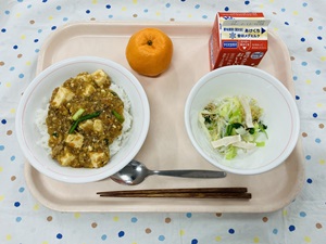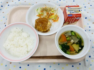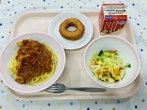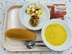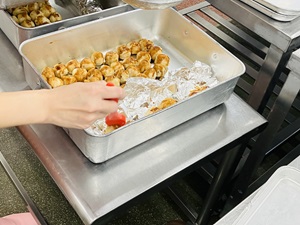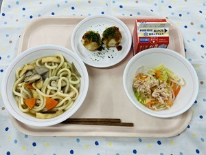 「たこやきポテト」は梅二小では久しぶりのメニューです。じゃがいもを蒸してつぶして切り分けたものに、たこを一つずつ丸めて揚げてつくります。上からソース、青のりをかけてまるで本物のたこやきのよう・・・!とても手間のかかるメニューですが、給食室のチームプレイで無事に出来上がりました◎