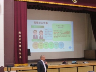 3年生の租税教室の様子です。「税は何のために集められ、何のために使われるのか」理解ができる中学生として、教えていただきました。
