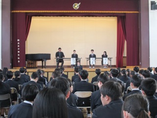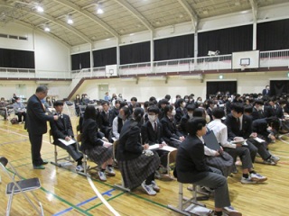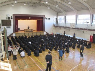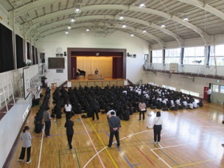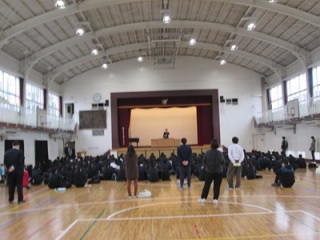 今日は、3・4校時の卒業式予行と各種表彰がありました。卒業式予行では、歌のパートごとのテンポがずれたり、代表生徒の出入りのコースが違っていたり、多少の修正点はありましたが、歌の声もよく出ており、3/19はいい式になるだろうと感じました。