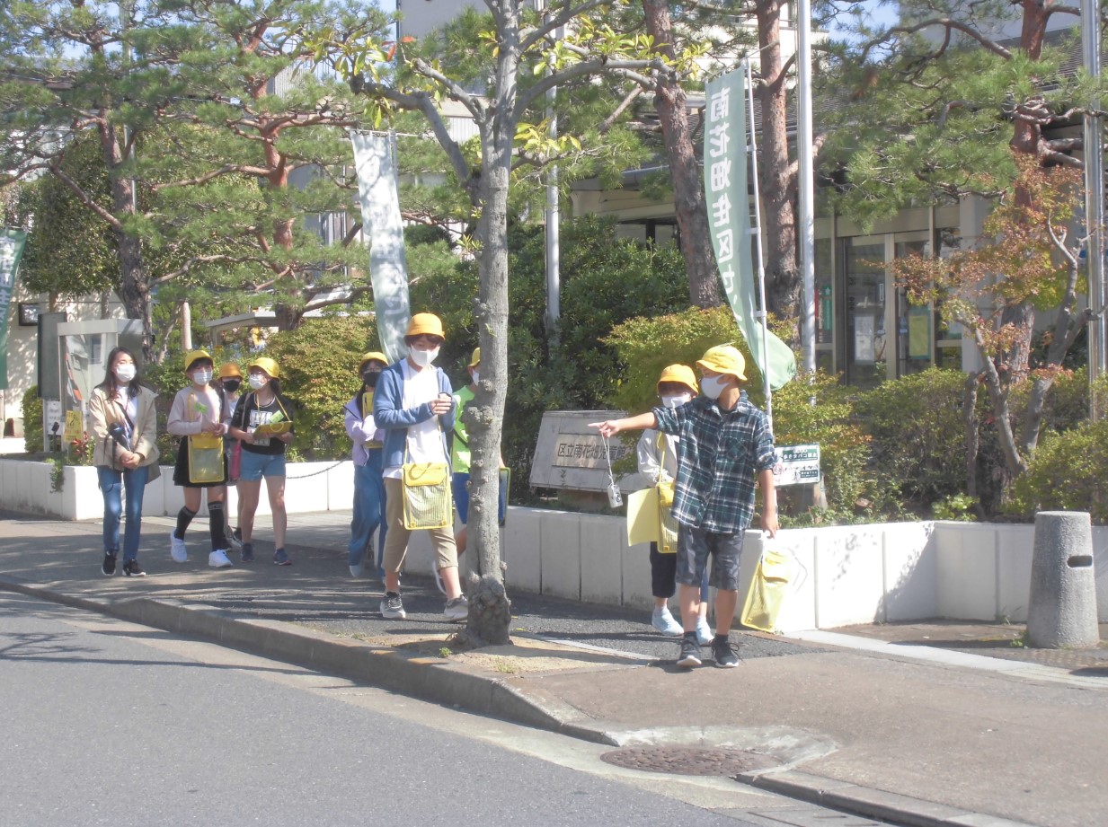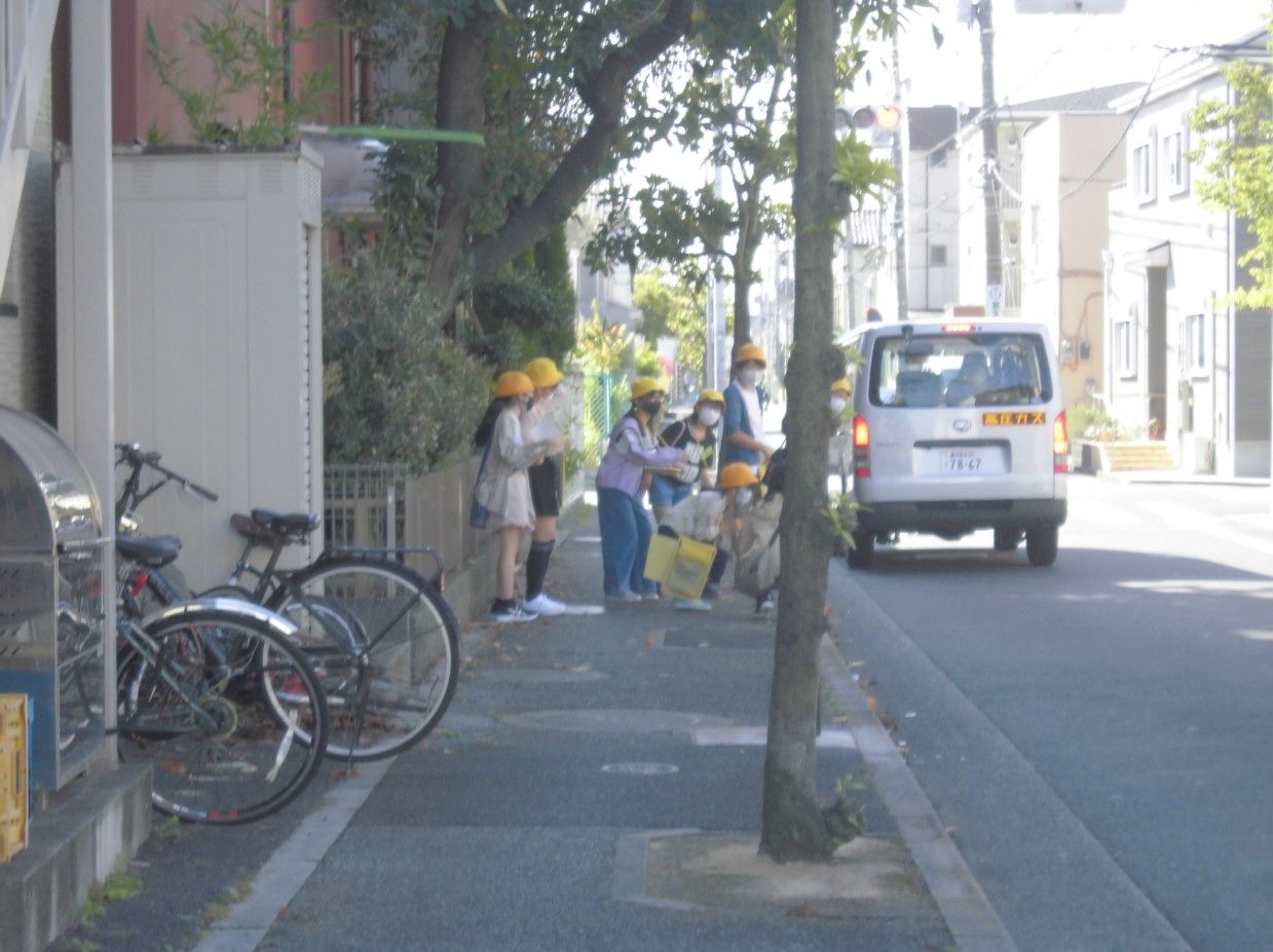 5年生が地域安全マップづくりのため地域に出て、危険なところ、安全な