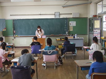 教室では隣と机を離した形での授業です。子供たちも3密になら
