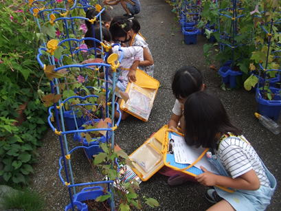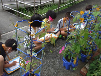 1年生は生活科で朝顔を育てています。大きく育ち、花が咲いているものや
