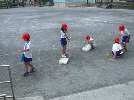 1年生が生活科でシャボン玉遊びをしました。いろいろな用具を使って