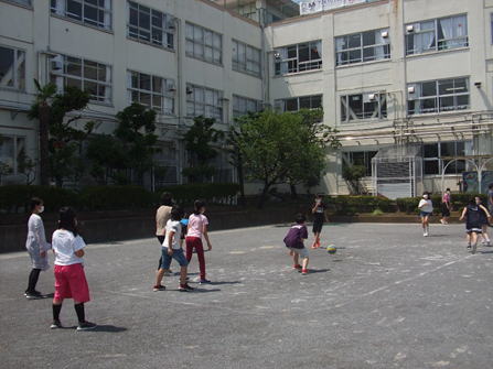 分散登校中ですが、休み時間は外で友達と楽しく遊びました。石鹸での手洗いも