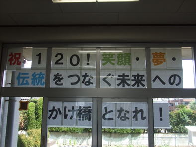 120周年のスローガンは「祝 120!笑顔・夢・伝統をつなぐ未来へのかけ橋となれ!」です。児童玄関口に掲示しています。ご来校の際はご覧ください。