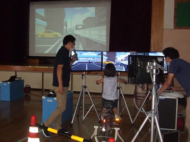 2年生と3年生が自転車の乗り方をシミレーションで学習しました。
