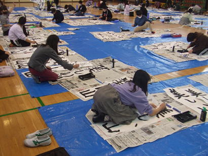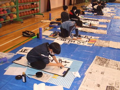 今日、明日と書き初め大会です。体育館では3年生から6年生が毛筆、