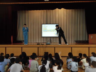 避難訓練後には、6年生が代表として救助袋を使用した避難方法を体験しました。素早く避難場所へ移動することが基本ですが、学校以外でもいざという時に使用する救助袋の体験をすることができました。また、1~5年生は、6年生の体験している姿を見学し、手足をあげて滑ることで、速く避難することができることを知ることができました。