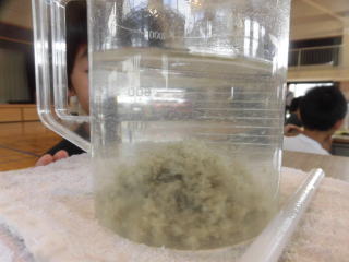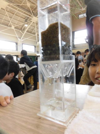 授業公開中に下水道局の方に来ていただき、特別授業を行いました。私たちが家や学校で使って汚くなった水が、水再生センターできれいにされて再び使われることを学習しました。実際に水再生センターで行われている沈殿を実験したり、トイレットペーパーとティッシュを水の中でかき混ぜる実験をしたりしました。トイレットぺーパーは水に溶け、ティッシュが溶けないのを体験したときには「だからトイレでティッシュは使ってはいけないんだ!」「トイレットペーパーはちゃんと溶けるんだ!」と驚きの声がたくさん聞こえました。