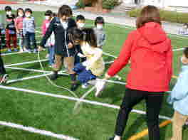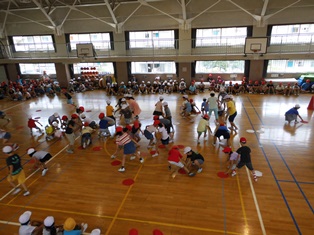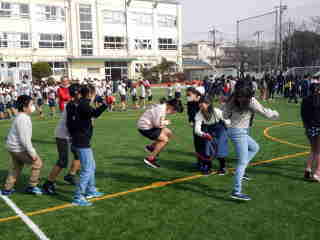 12月の児童集会は、縦割り班対抗「フラフープ送り」です。みんなで手をつなぎ、いかに早く最後まで送ることができるか...。フープを足からくぐる子、頭からくぐる子、距離を縮める子...コツをつかんだ子が、声を掛け合いながら、楽しく競い合っていました。