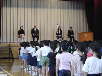 代表の児童から、送る言葉と花束のプレゼント。離任された先生方からは、近況を教えていただきました。