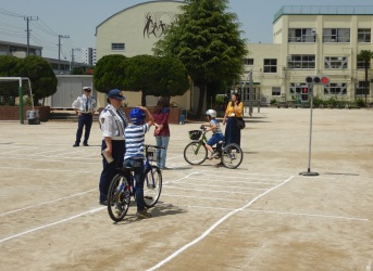 次に、校庭で実際に自転車に乗って、乗り方の指導をしていただきました。