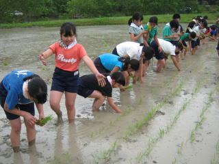 田植え体験では、裸足で田んぼに入り、初めての感触に大騒ぎしながら、田植えを行っていました。苗と苗の間隔や、苗を植える深さに苦戦していました。