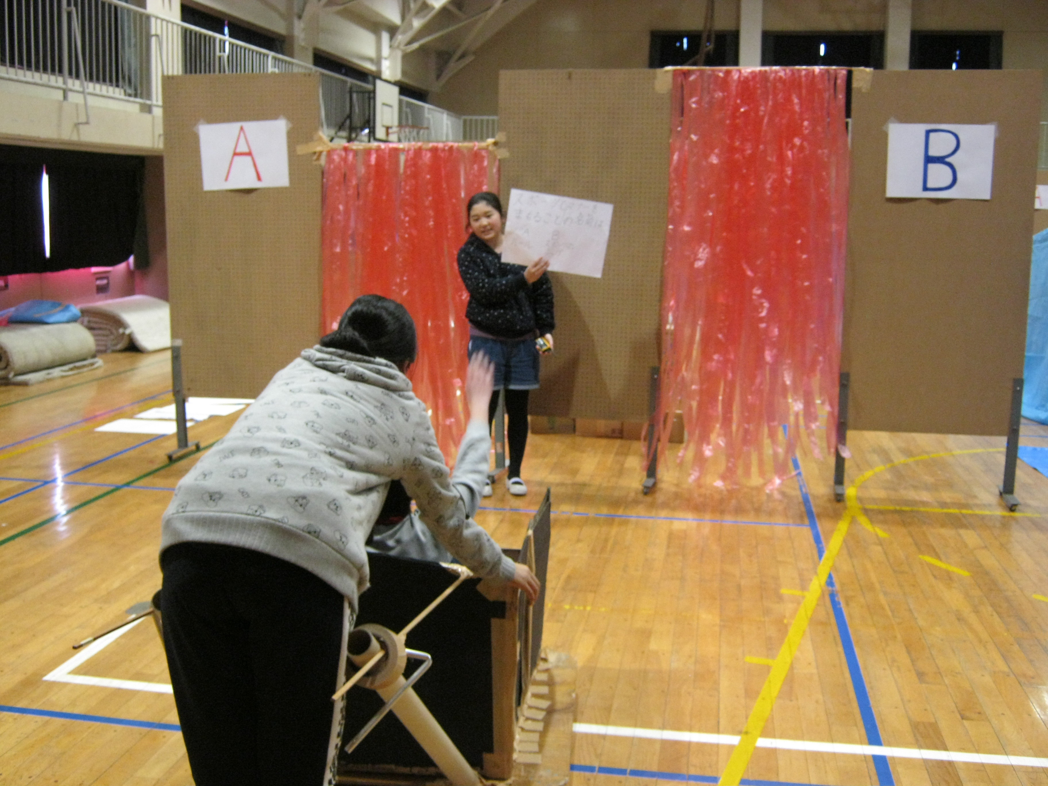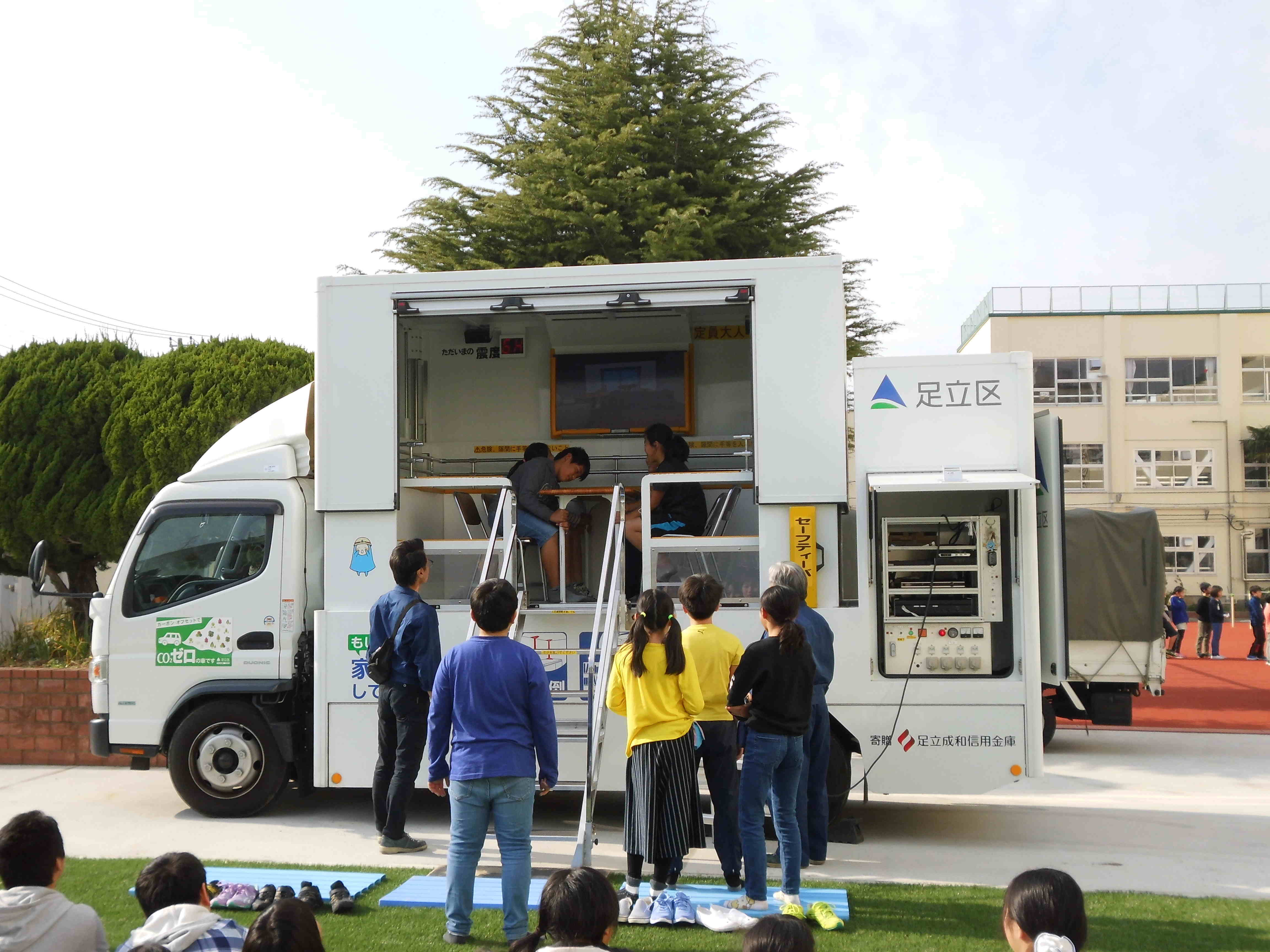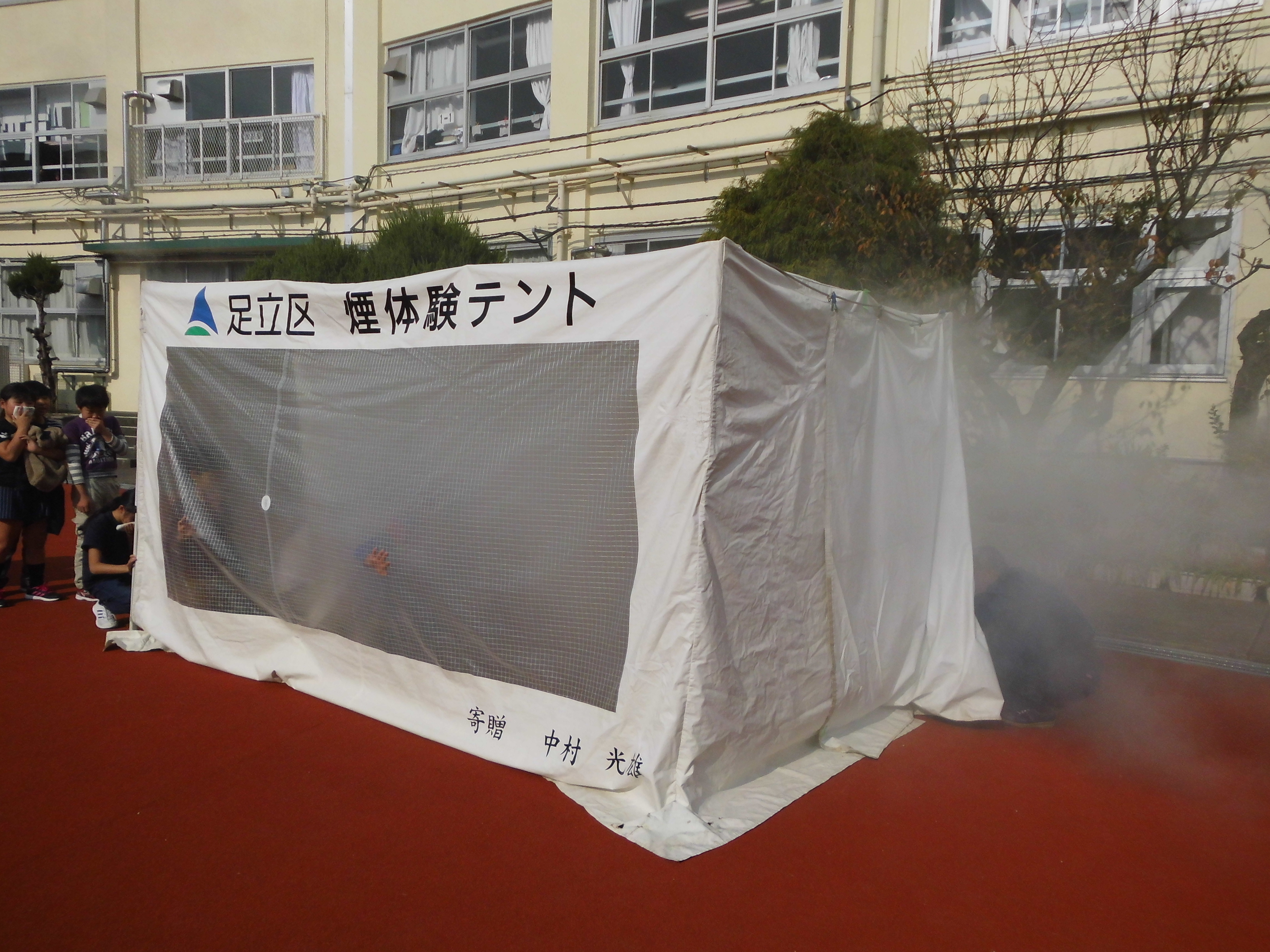 地震体験車では、机をつかんでいても体が吹き飛ばされるような揺れを体験しました。煙ハウスでは充満した煙で前が見えない中、一歩一歩前に進みました。足立区の災害対策課の皆さんの協力のおかげで貴重な体験ができました。