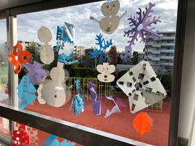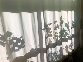 切り紙は、カーテン越しで日差しを浴びると、揺らめく影が幻想的です。ご家庭でもぜひお試しを...。
