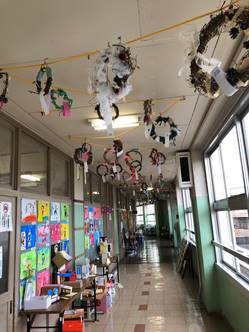 1年生の教室や廊下も、クリスマス仕様になっています。生活科の学習として、1年間育ててきたアサガオのつるを使い、クリスマスリースを作りました。