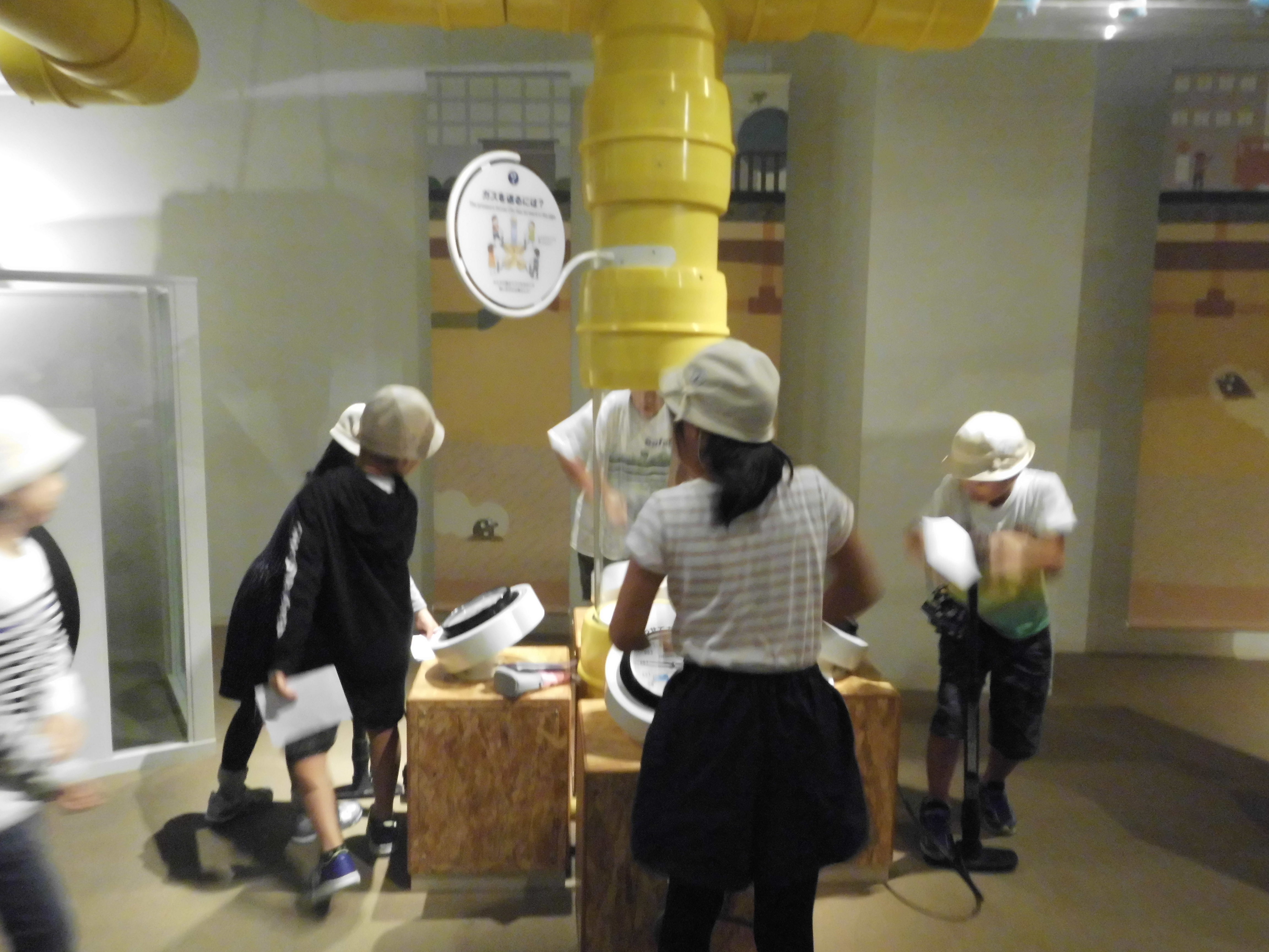 道路の脇にある雨水が流れるところの名称『雨水ます』を知り、ジオラマを用いて『雨水ます』に石やごみが詰まってしまうと水が流れなくなり、道路が水浸しになってしまうことを知り、「石を雨水ます蹴ったことがあるけど、もうやめよう」と、下水道の大切さを実感できました。