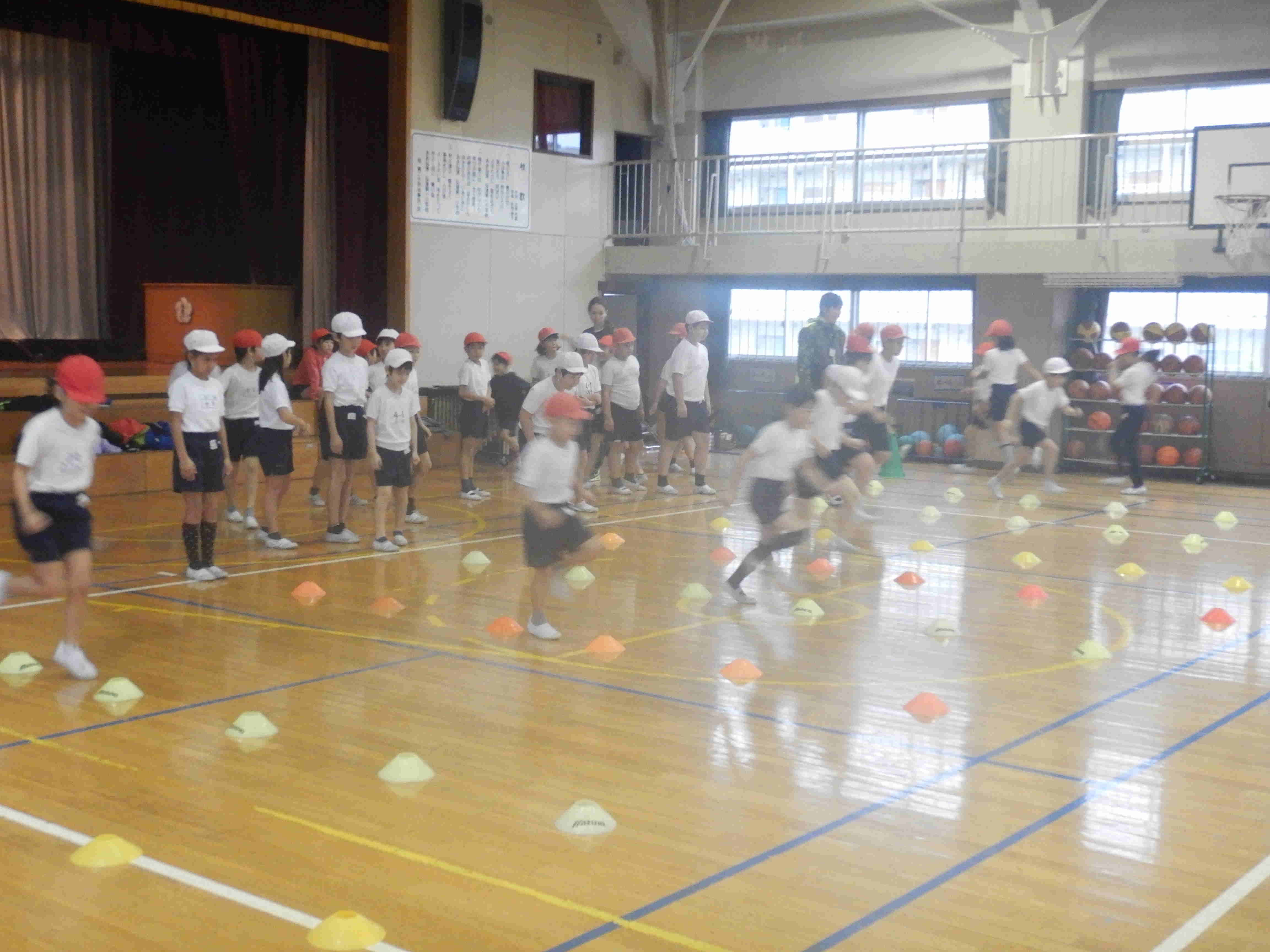 また、走るときの一歩を大きく開くために、走るコースに小さいコーンを置き、コーンとコーンの間を一歩ずつ走る練習を行いました。姿勢を正し、目線を上げて走れるようになるまで何度も練習し、速く走れるようになってくると自然と笑顔がこぼれ、「もう一度走りたい!」と走ることに対して積極的な児童が多く見られました。