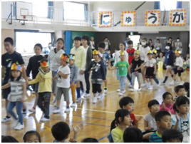 1年生が音楽に合わせて、元気に笑顔で入場してきました。頭には2年生からのプレゼントされた王冠がキラキラ輝いています。5年生からはぴょんぴょんがえるが送られました。 |