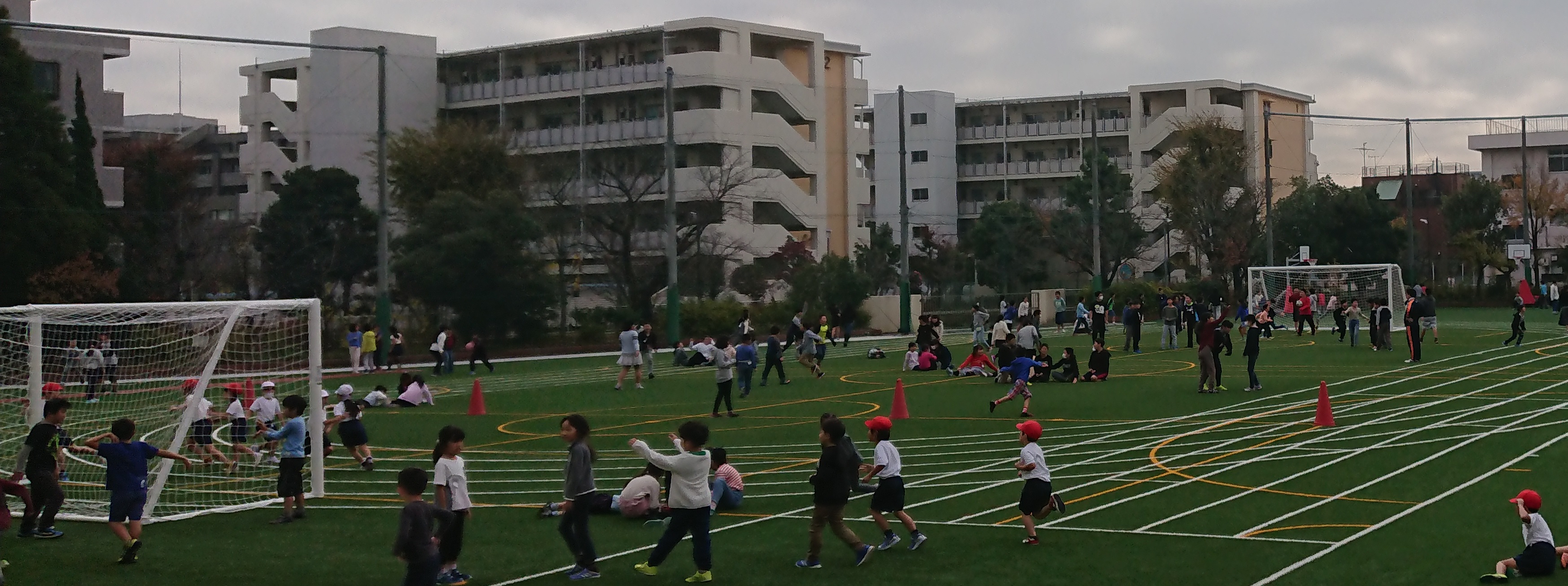思い切り走り回る子や、バスケットゴールに向かってシュートを放つ子(4つもあるので、混雑もしません)がいます。しかし一番目立ったのは芝生の上に座って話し込む子たちです。1年生から6年生まで、まるで全校で遠足に行った公園の原っぱの上で、それぞれがお話をしているかのようでした。みんな新しくなった校庭をそれぞれの楽しみ方で味わっています。