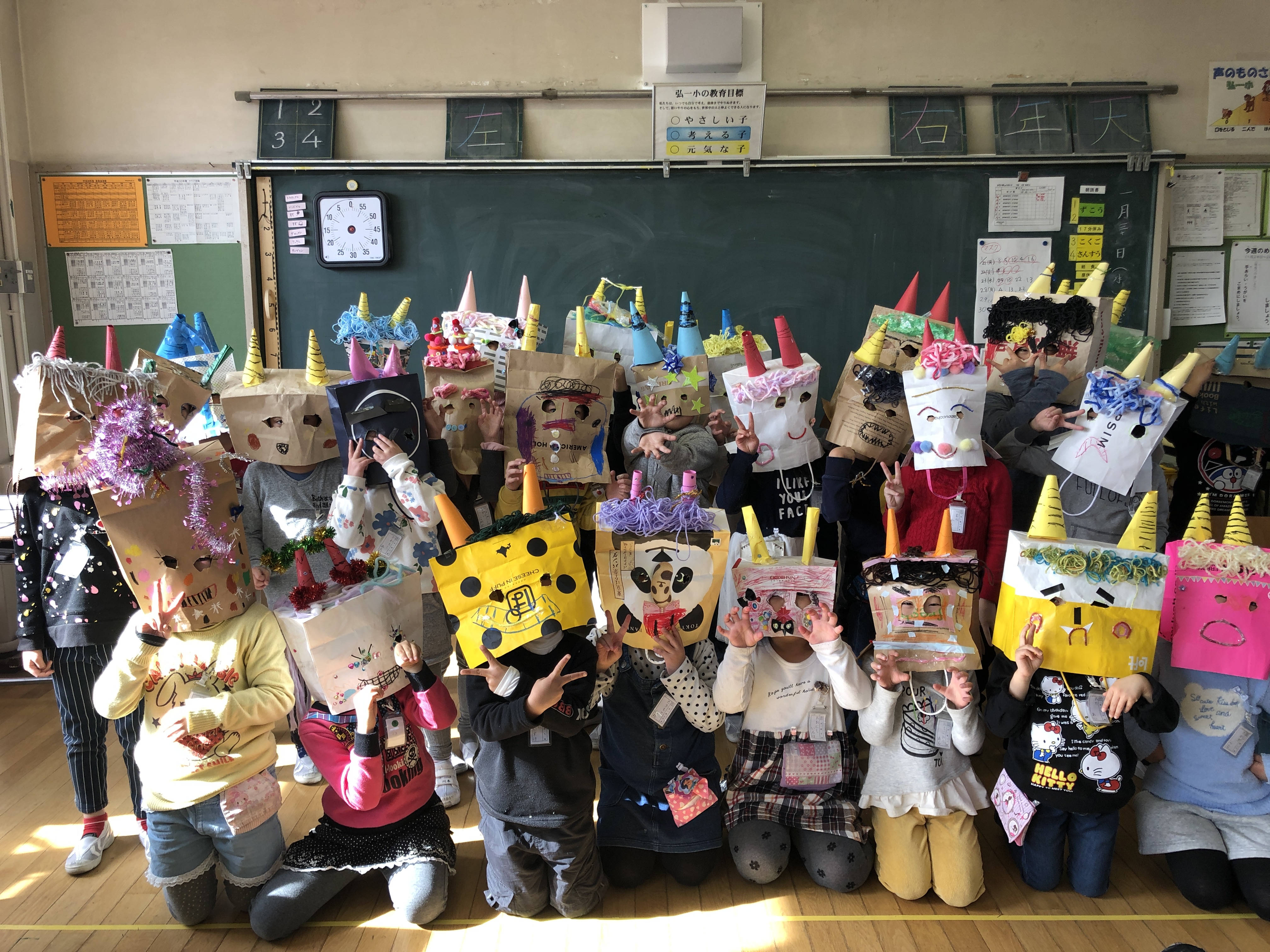 今回の図工は、「おめんで へんしん」。季節柄、いろいろな鬼のお面作りをしました。どんな鬼にしたいかを決め、飾りをつけたり、色付けしたり...。「怖い鬼を作ろうと思ったんだけど、かわいくなっちゃった。」「怖いとか、面白いとか、悲しいとか、いろいろな鬼が混ざっちゃったよ。」「〇〇ちゃんの面白いね。」など、様々な声が飛び交いました。最後は、みんなで記念撮影♪「ねぁ、先生。この鬼がいっぺんにお家に来たらどうする?」と聞いてくる子がいました。私は「ワクワクして、うれしくなっちゃう」のですが、皆さんはどうしますか?