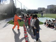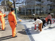 その後、4年生と5年生の児童が足立消防署綾瀬出張所のご協力で、初期消火訓練を行いました。消火器の正しい使い方を、実物とほとんど同じものを使って説明していただき、各クラスから代表児童3名が実際に訓練させてもらうことができました。