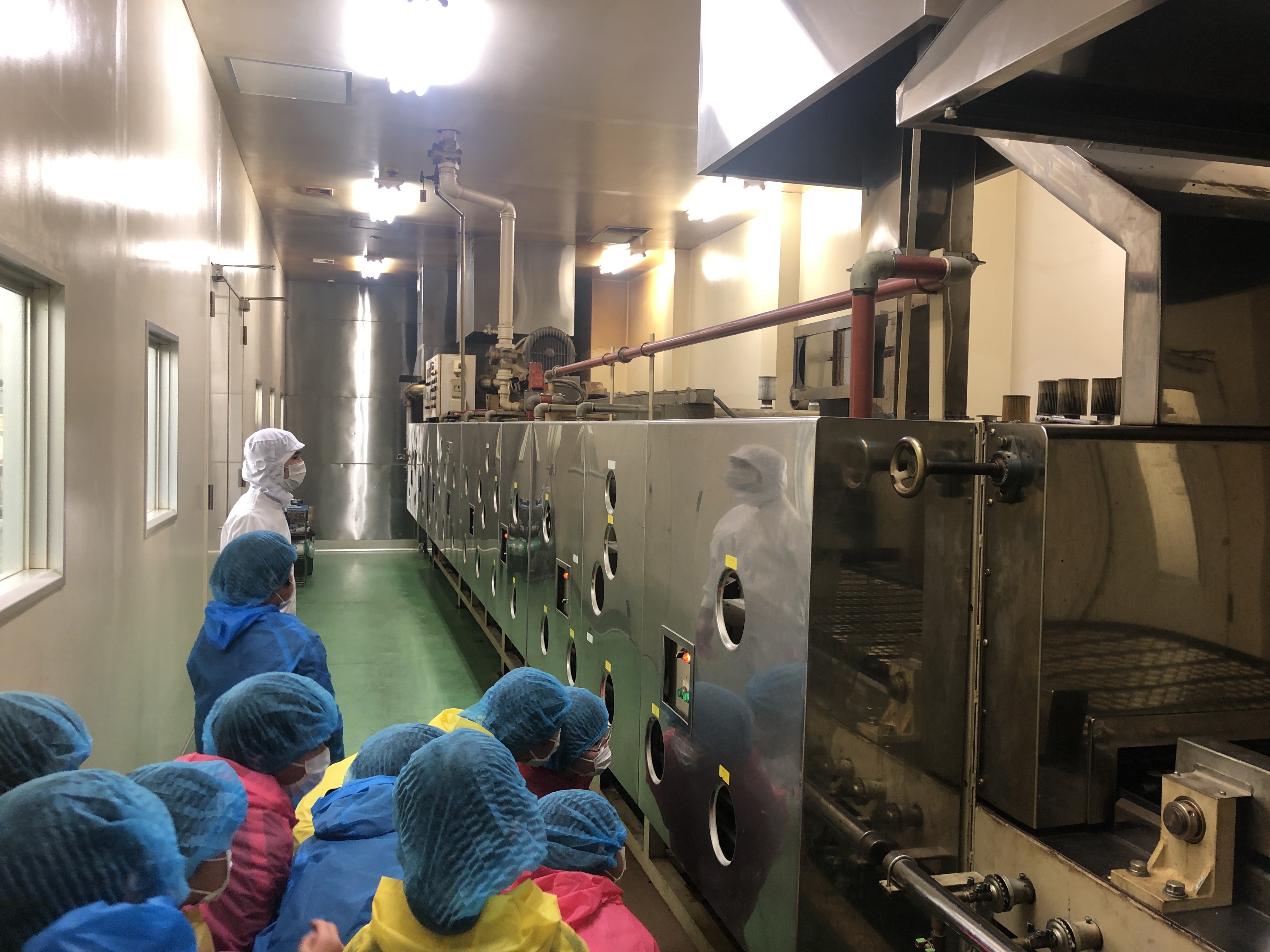 「三黒製菓」では、工場内でお菓子作りの様子を見学してきました。焼き上げる行程の場所では、熱が伝わって来るほど間近で見ることができました。熱だけでなく、美味しそうな香りもしてきて「食べたいなあ。」という声もあがりました。もちろん、その後で出来上がったばかりのお菓子をいただき、みんなニッコリでした。