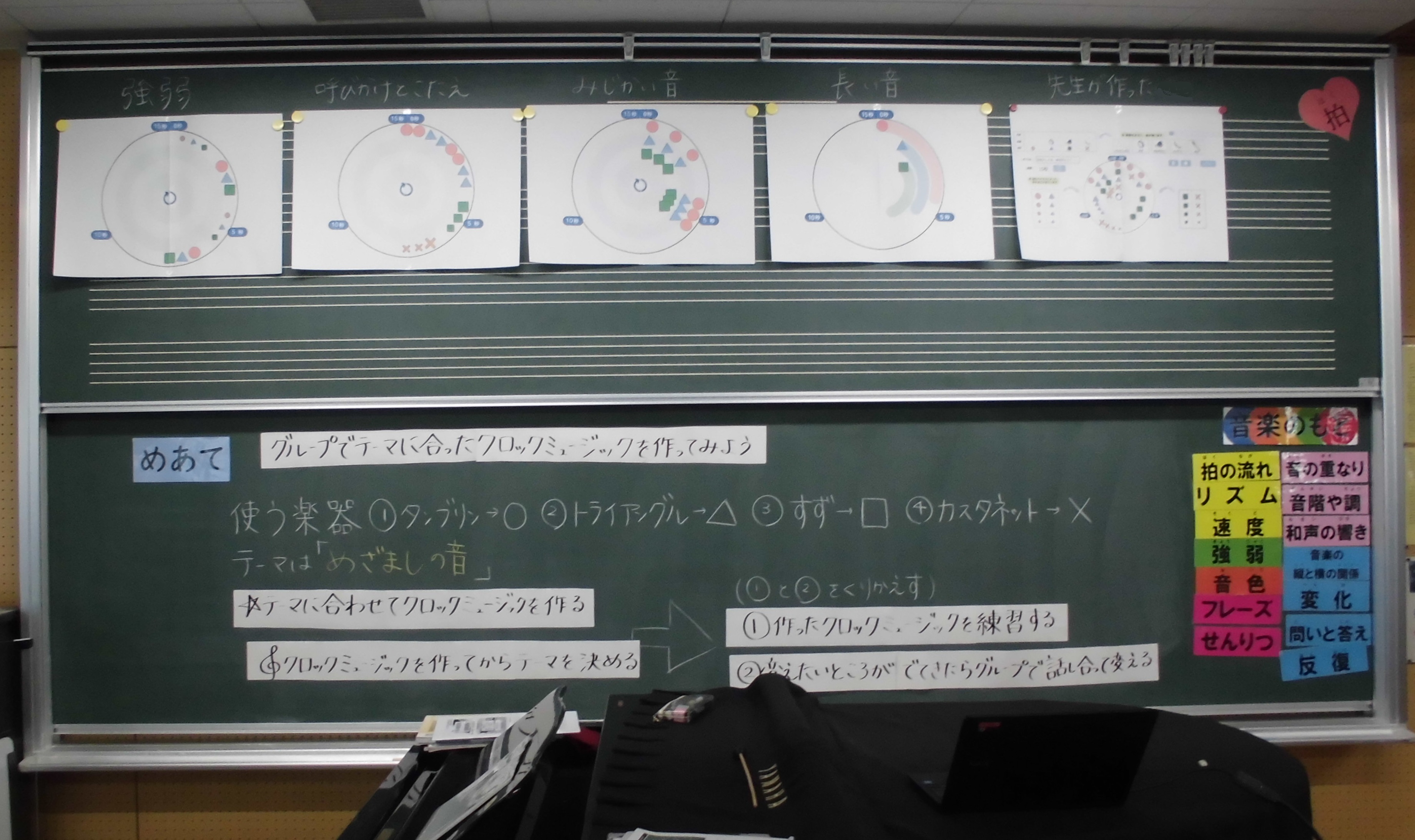 〈ねらい〉 打楽器の音色や響きの特徴を生かして、音の重ね方やつなげ方を考えながら自分達の音楽を作る。