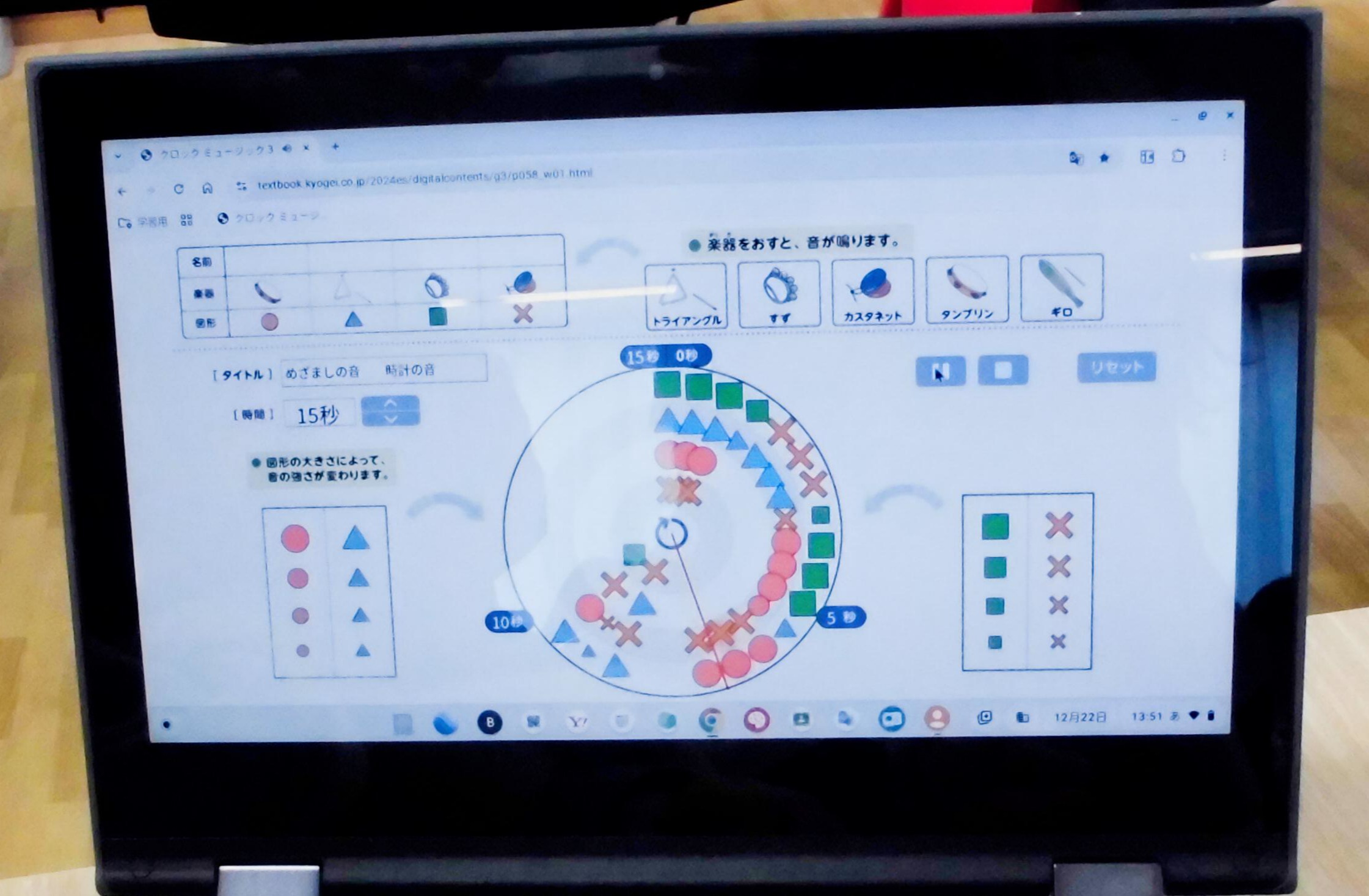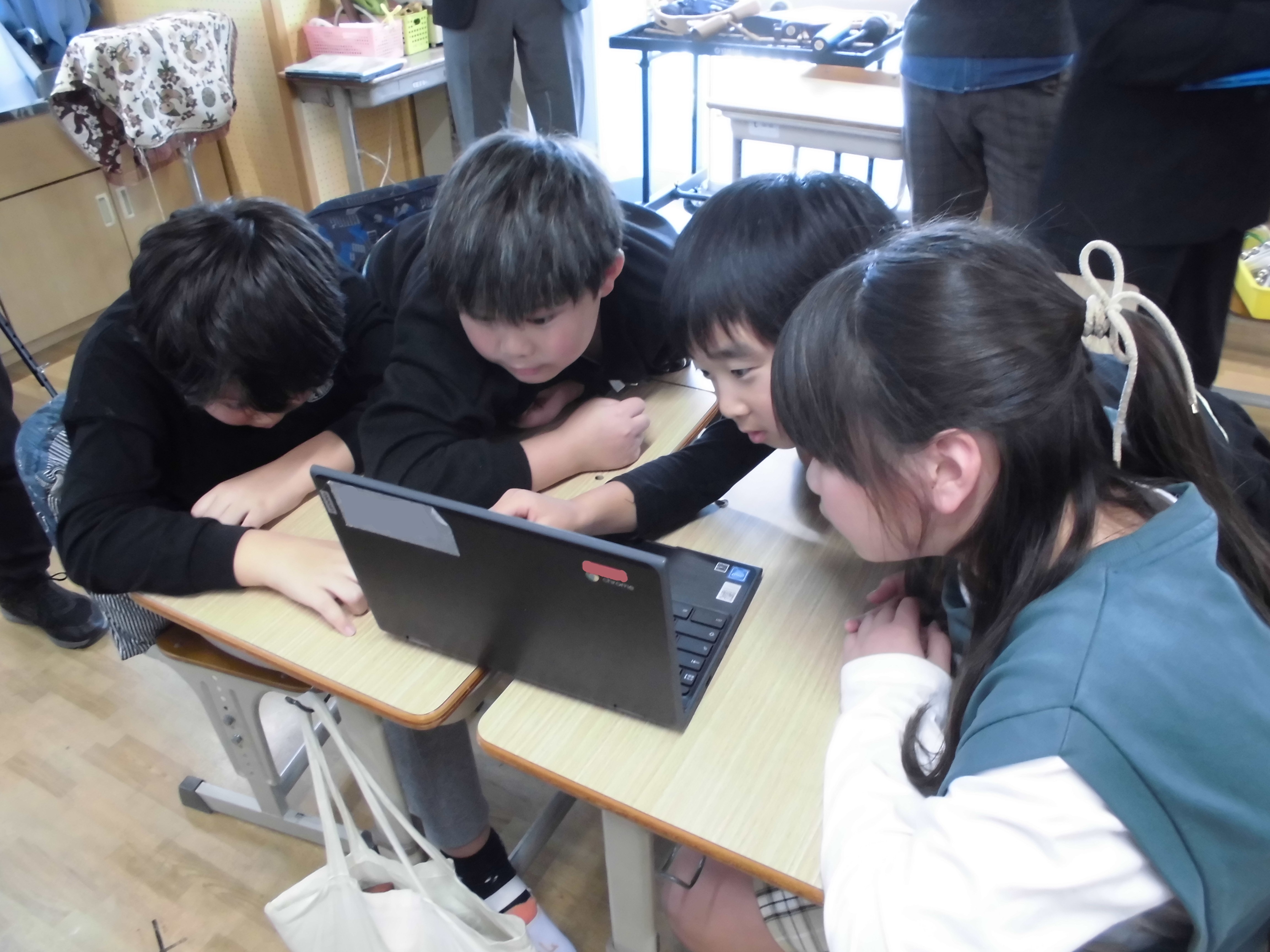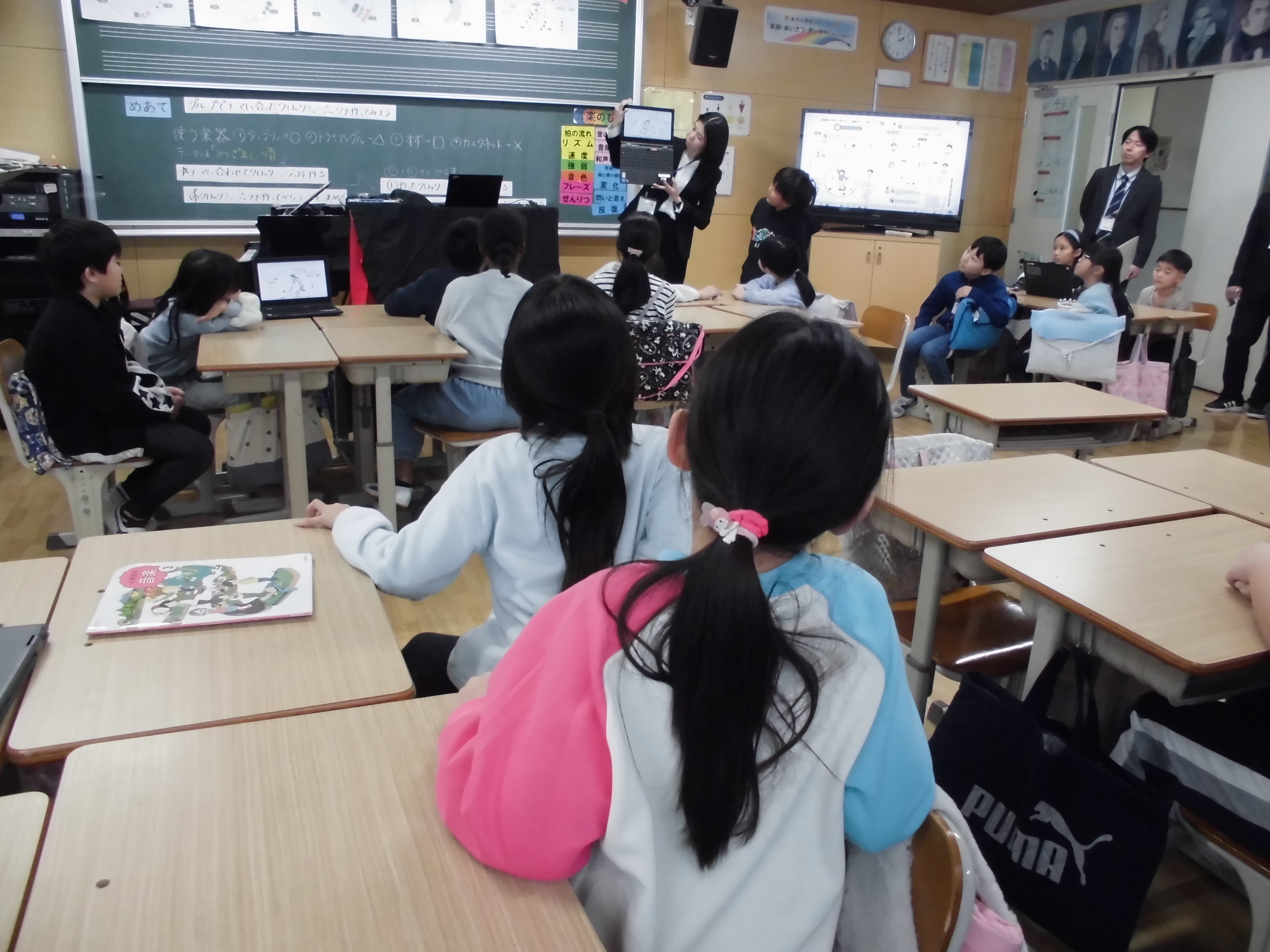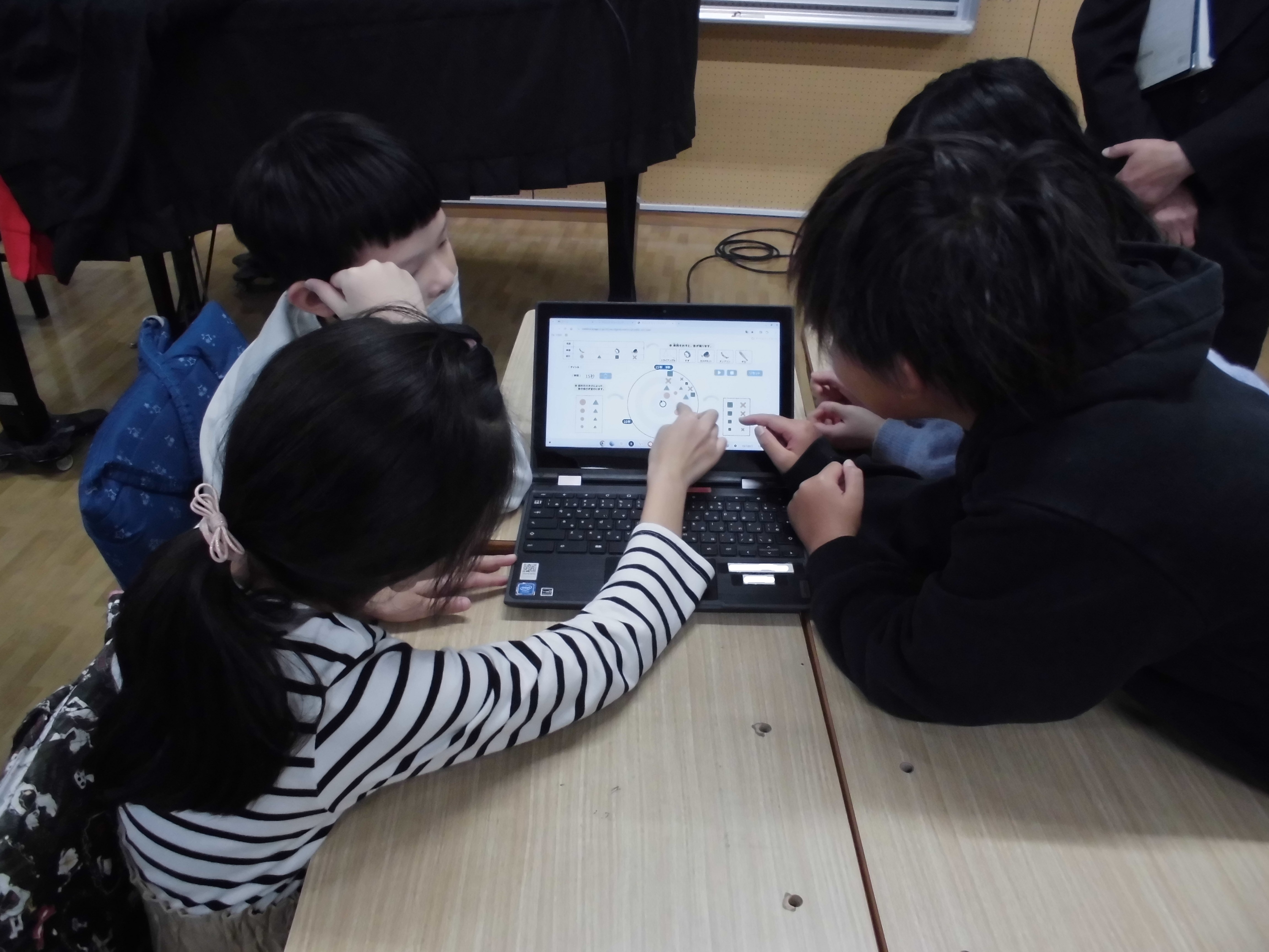 クロムブックを活用し、楽器の種類や音の大きさを視覚的に捉え、再生して確認することを繰り返しながら音作りを行いました。
