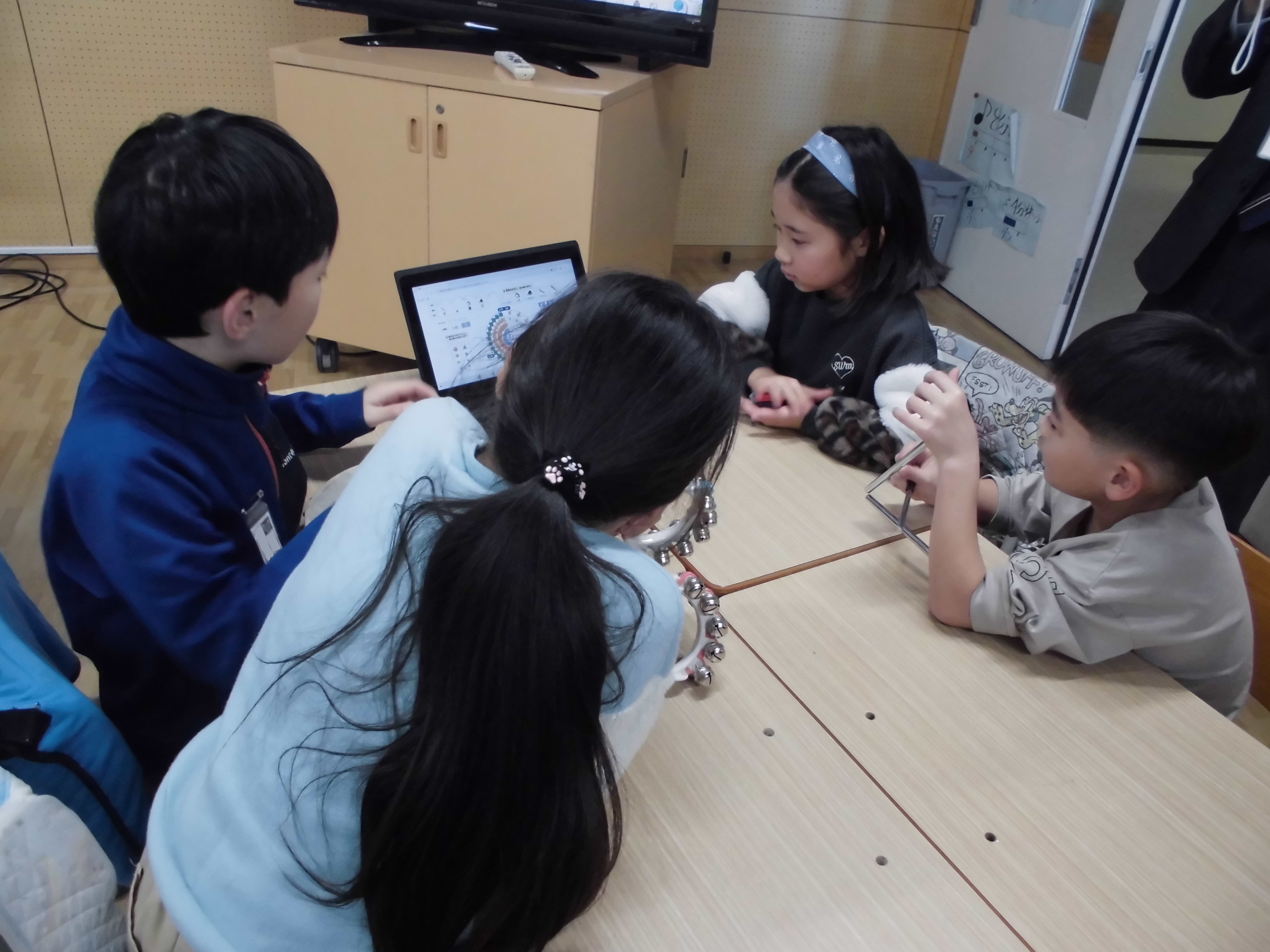 「めざましの音」をテーマにして、タンブリン、トライアングル、すず、カスタネット、から自分達のグループでどの楽器を使うか決めて音楽作りに取り組みました。
