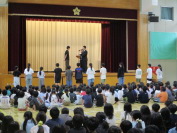 各学年の出し物を見た後、6年生代表児童と各学年代表児童が、玉入れやけん玉、二重跳びや長縄などの対決をしました。一緒に過ごす残り僅かな時間を楽しみました。最後に全校児童で「いのちの歌」を合唱しました。高学年のハモリが加わったことで、感動もひとしおでした。