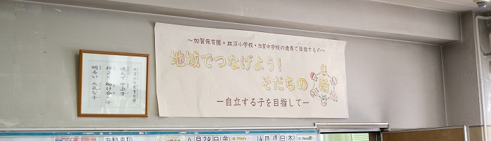 これは将来の「自立」を目指しています。「自立」、これは開校当初に建てられた石碑に刻まれた本校の目指す姿でもあり、加賀保育園、加賀中学校との連携教育で育む姿でもあります。