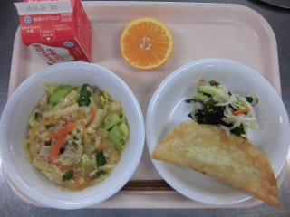 <食材の産地> にんじん・・・北海道 玉ねぎ・・・北海道 長ねぎ・・・岩手県 チンゲン菜・・・埼玉県 キャベツ・・・愛知県 もやし・・・栃木県 みかん・・・福岡県 ※牛乳は、茨城県・千葉県・群馬県・栃木県・北海道・山形県・宮城県の原乳を使用しています。 ※現在出荷制限されている食材については、給食に使用していません。