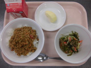 <食材の産地> にんじん・・・千葉県 えりんぎ・・・長野県 玉ねぎ・・・北海道 しょうが・・・熊本県 パセリ・・・千葉県 キャベツ・・・千葉県 もやし・・・栃木県 りんご・・・長野県 ※牛乳は、茨城県・千葉県・群馬県・栃木県・北海道・山形県・宮城県の原乳を使用しています。 ※現在出荷制限されている食材については、給食にしようしていません。