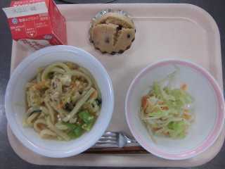 <食材の産地> キャベツ・・・茨城県 もやし・・・栃木県 にんじん・・・千葉県 レモン・・・愛媛県 ごぼう・・・青森県 だいこん・・・千葉県 さといも・・・栃木県 長ねぎ・・・岩手県 ※牛乳は、茨城県・千葉県・群馬県・栃木県・北海道・山形県・宮城県の原乳を使用しています。 ※現在出荷制限されている食材については、給食に使用していません。
