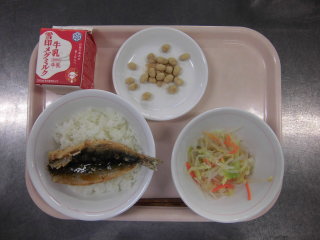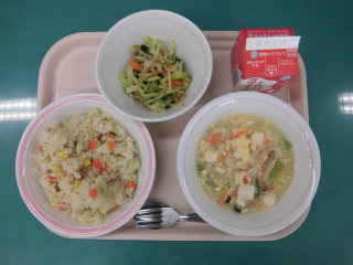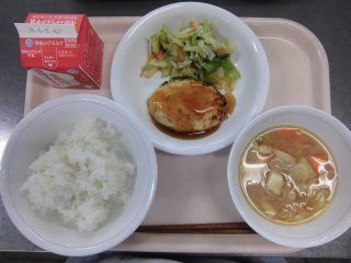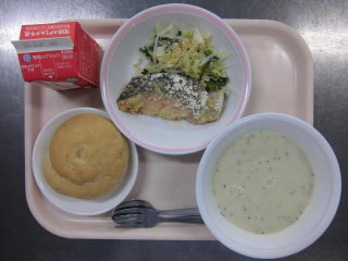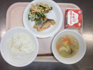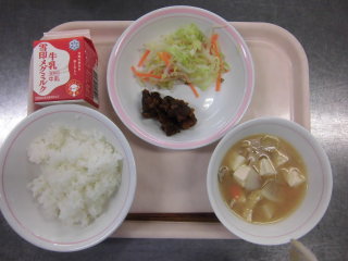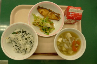 | 大豆入りひじきごはん 魚のレモン焼き 豆腐とたまごのスープ 牛乳 |