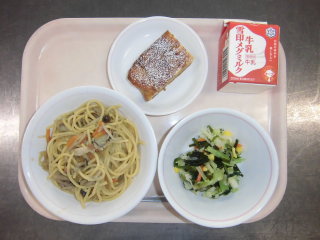 | ミートソーススパゲティ 茎わかめサラダ 菊花みかん 牛乳 |