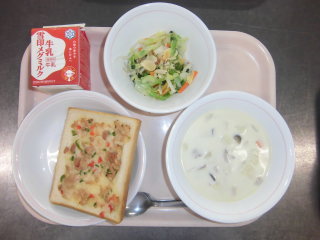 | ツナトースト アーモンドサラダ 豆乳チャウダー 牛乳 |