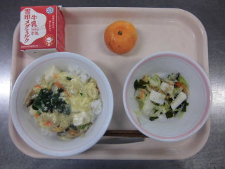 | 豆腐とたまごのふわとろ丼 イカとわかめのサラダ みかん 牛乳 |