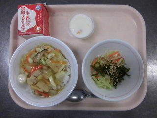 | 中華丼 茎わかめの中華サラダ 杏仁豆腐 牛乳 |